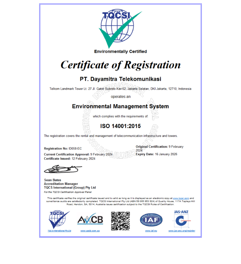 Mitratel mendapatkan re-sertifikasi ISO 14001:2015 (Environmental Management System) sebagai Standar International yang menetapkan pedoman untuk sistem manajemen lingkungan pada tanggal 12 Februari 2024.