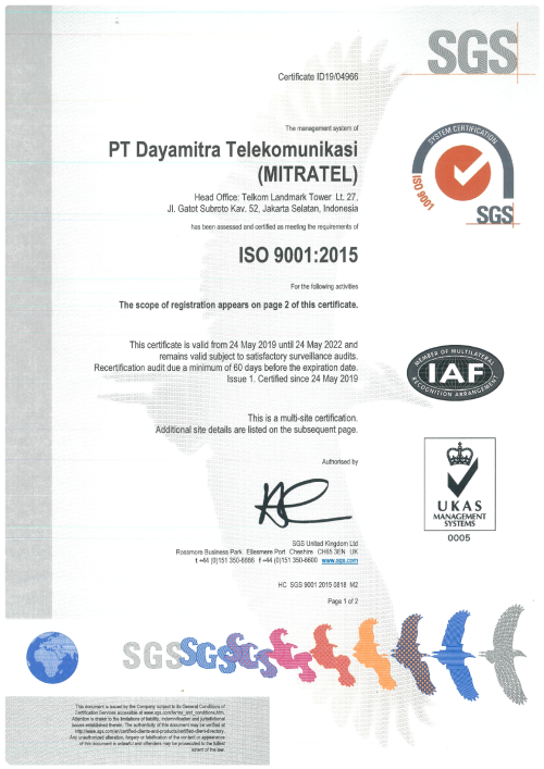 Mitratel mendapatkan sertifikasi ISO 9001:2015 untuk Sistem Manajemen Mutu dengan ruang lingkup Rental and Management of Telecommunication Infrastructure and Towers.